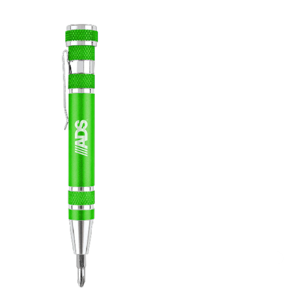 9-in-1 brushed color and silver finish aluminum pen-shaped tool kit. Includes screw-top body (holds 4 flathead and 4 Phillips metal bits) with firm hold magnet to secure bits at the tip, and shiny silver pocket clip.